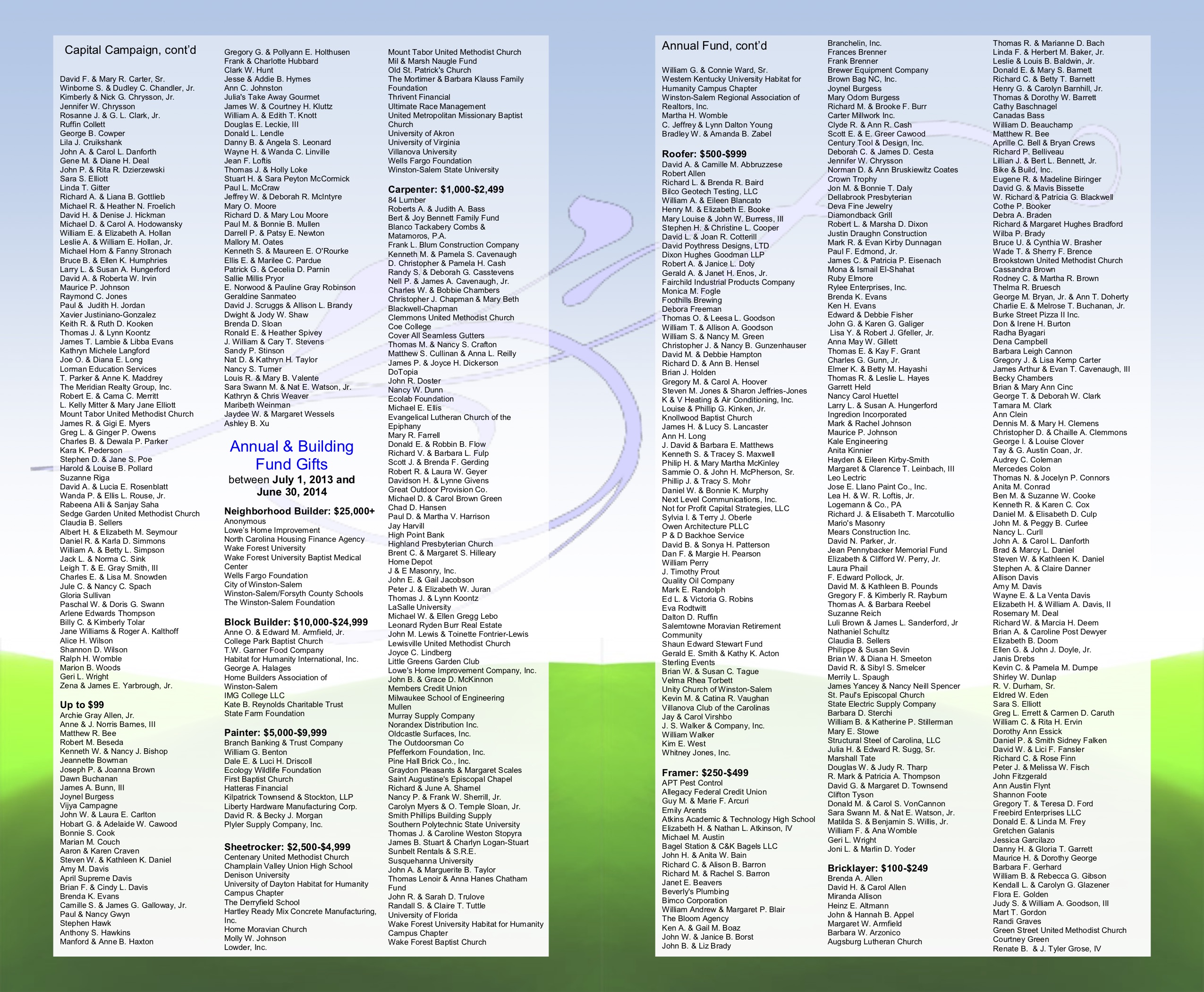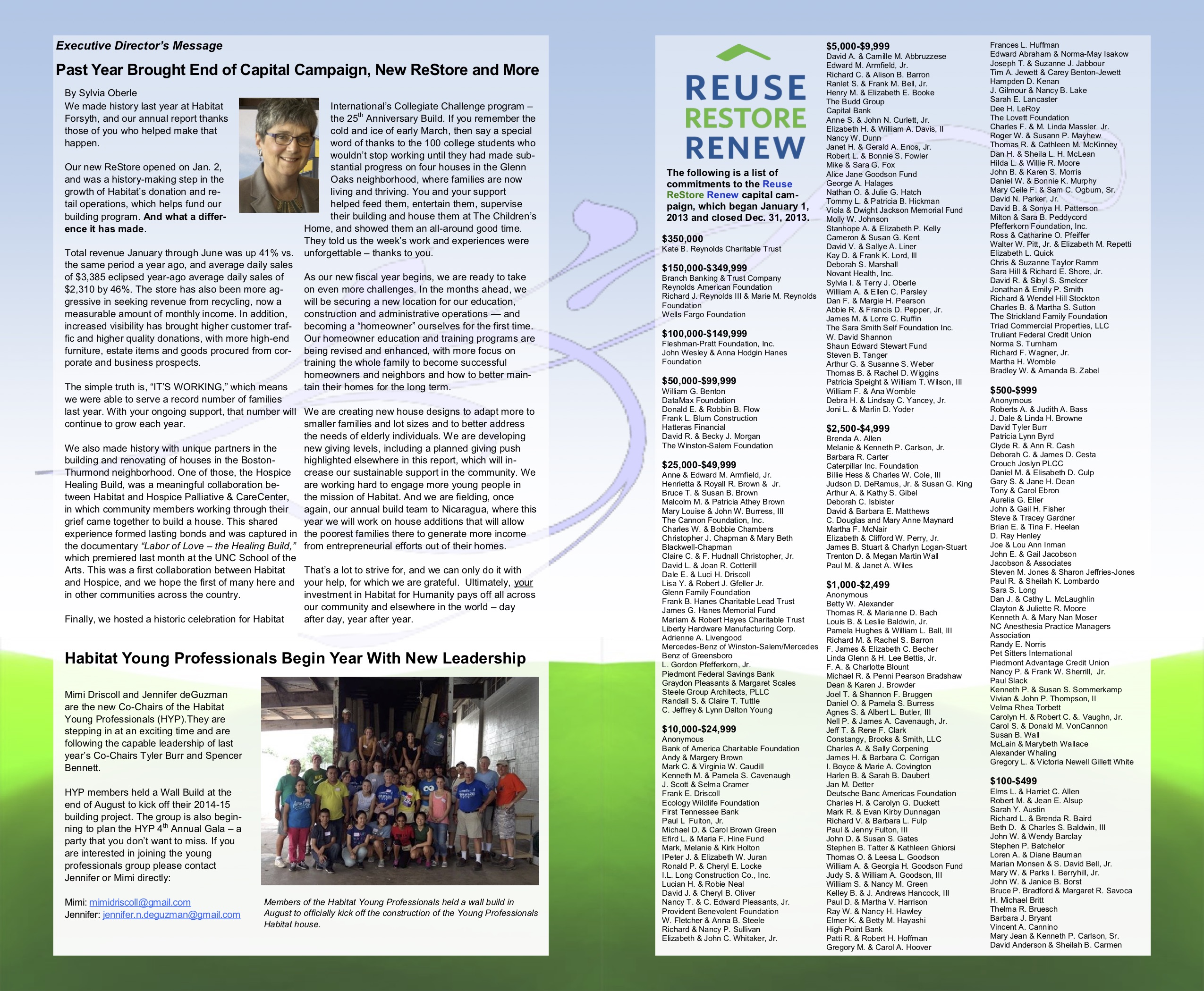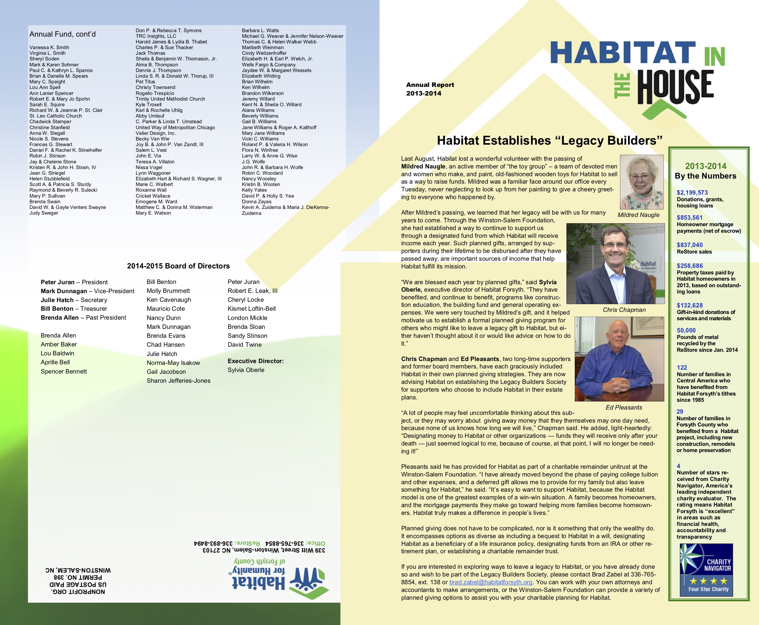 The annual report below includes a statement from Sylvia Oberle, the Habitat Forsyth Executive Director, and a list of our FY 2014 donors.