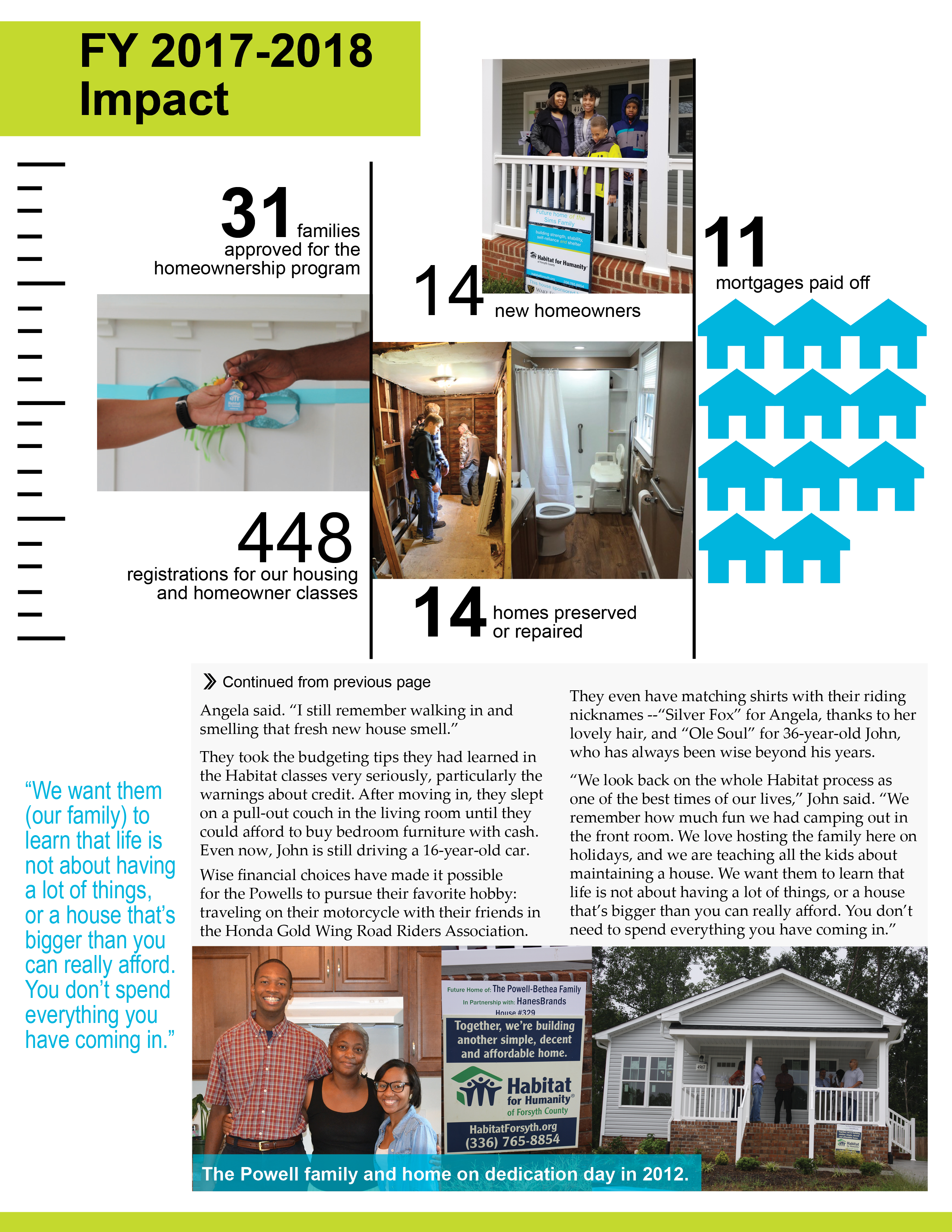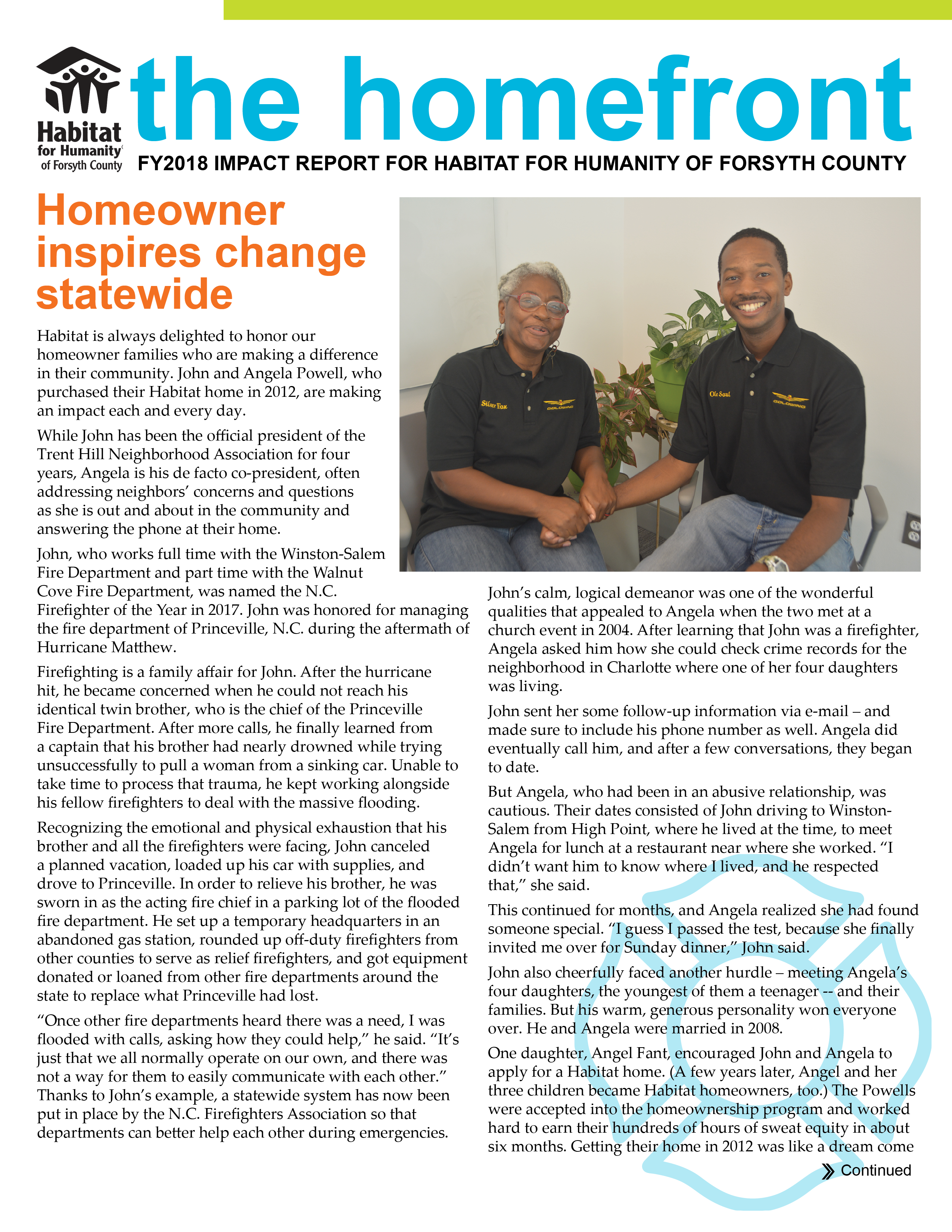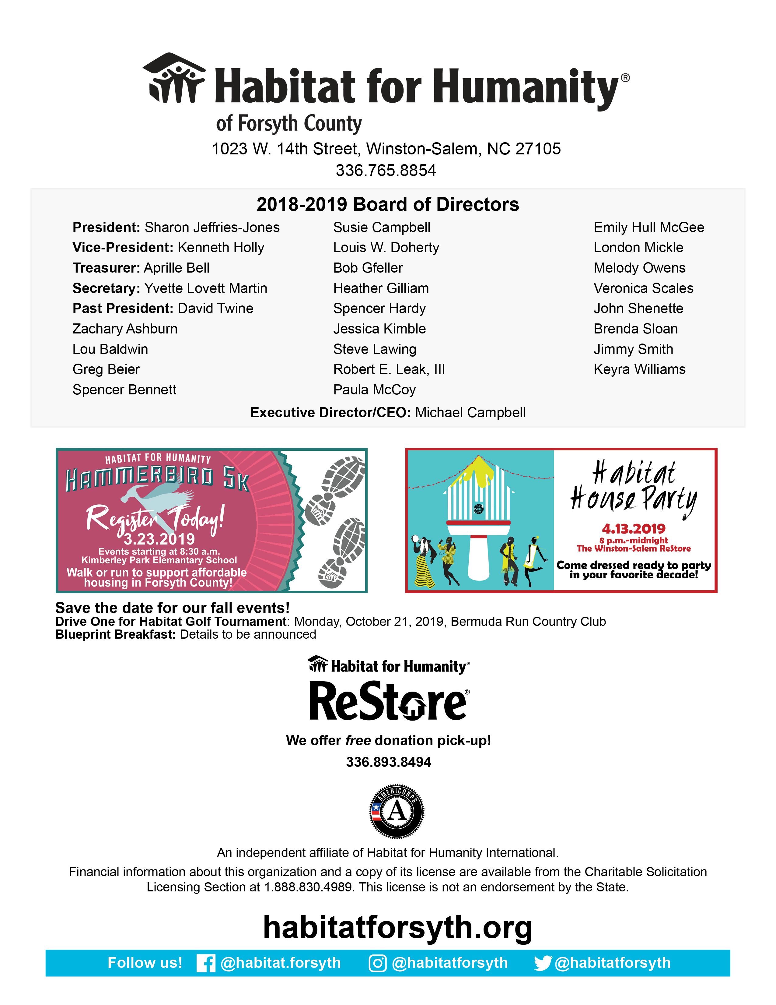 Habitat Forsyth was proud to celebrate the 31 hardworking families who were a part of our homeownership program as well as the 11 homeowners who paid off their mortgages during the 2018 fiscal year. Our campus was host to 474 volunteers who served 16,590 hours to build and repair homes through the Collegiate Challenge program. Mr. Powell, a Habitat homeowner since 2012 was also named North Carolina’s Firefighter of the year.