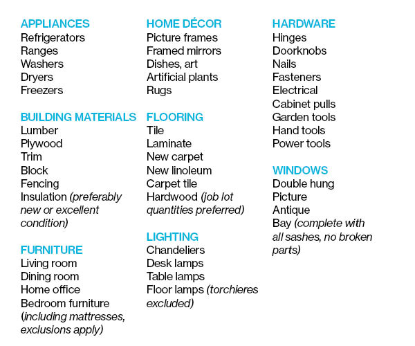 FURNITURE: We do not accept Sleeper Sofas, Entertainment Centers, Desks longer than 36 inches, Blinds with cords (We accept cordless blinds). TV’s with NO cords. No Ladders of any kind, Baseless Counter Tops (Counters on Vanities or Kitchen cabinets are accepted), NO USED TOILETS, USED BATH TUBS.