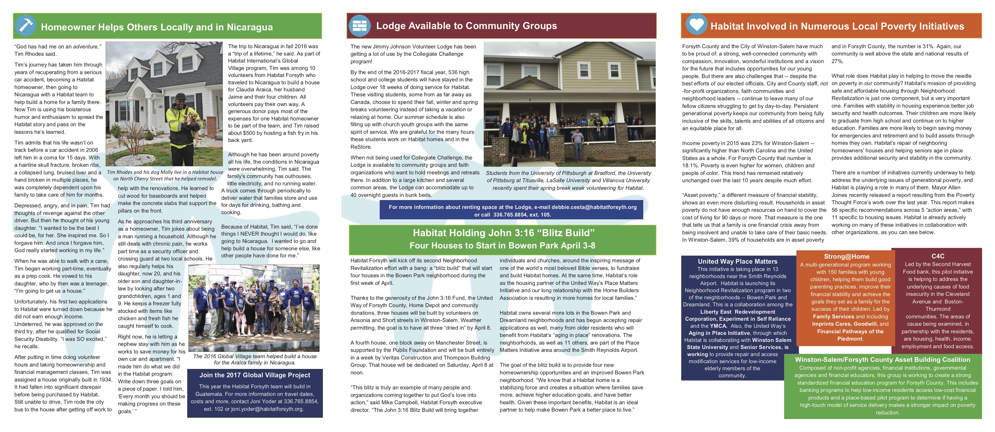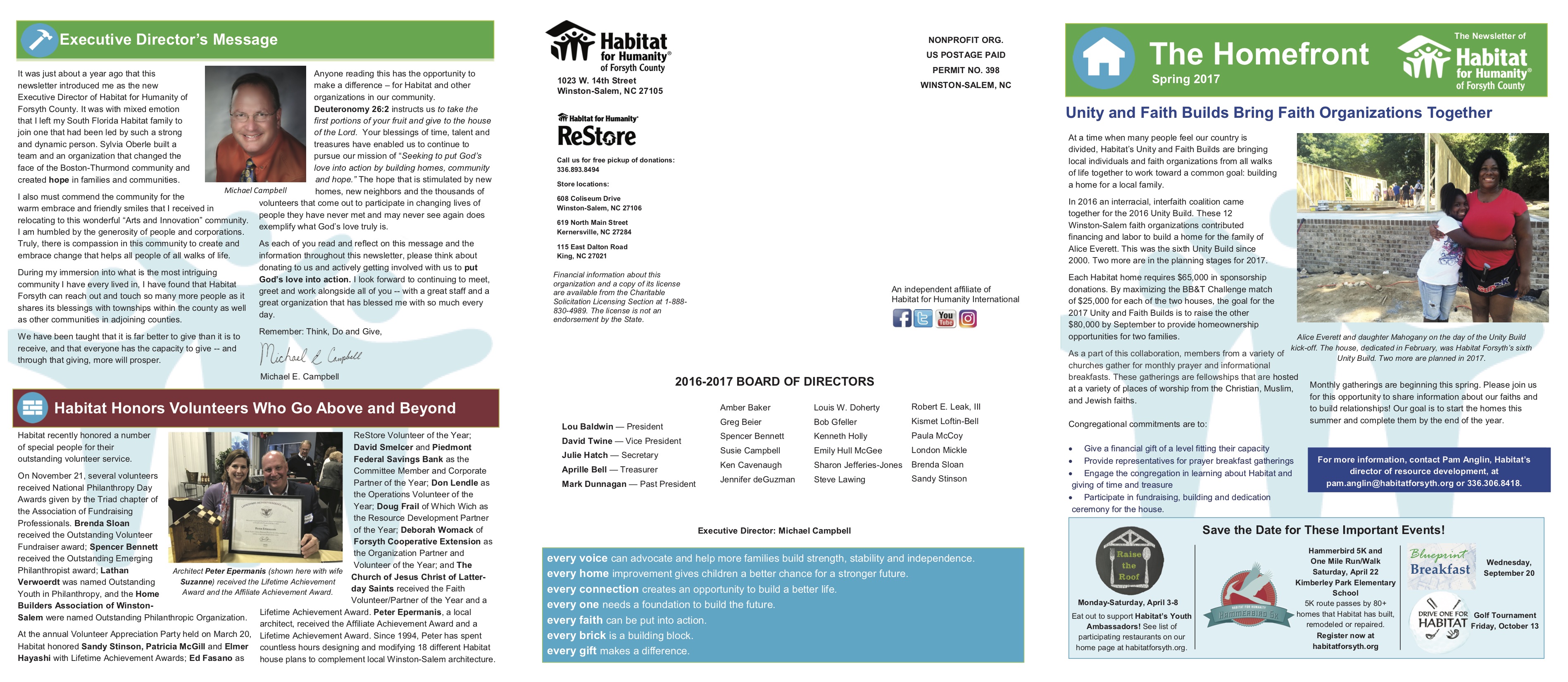 This season’s newsletter includes a section dedicated to some of our hardworking volunteers who received awards this past November from the Triad chapter of the Association of Fundraising Professionals, as well as those who were honored at our Volunteer Appreciation Party this March. The Jimmy Johnson Volunteer Lodge was also highlighted, noting that the 2016-2017 fiscal year had housed 536 high school and college students over 18 weeks that were dedicated to Habitat service. A message from Executive Director Michael Campbell, information about this year’s Faith and Unity Builds, Habitat’s partnership with local initiatives, and an excerpt about one homeowner’s trip to build in Nicaragua can be found in this newsletter as well.